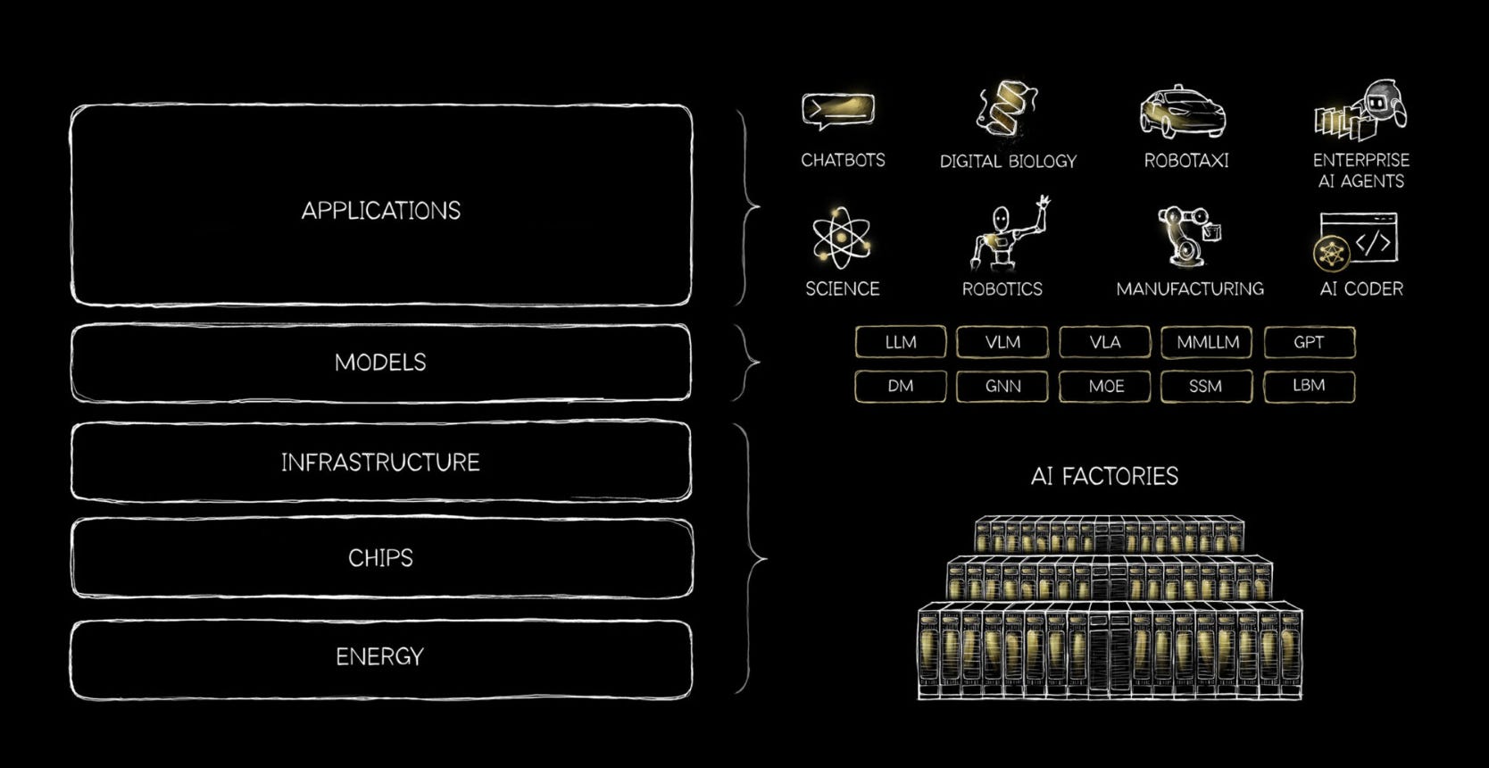 “이제 지능이 실시간으로 생성되고 있기 때문에 AI 공장들이 세워지고 있습니다. 효율성이 지능의 확장 속도를 결정하기 때문에 반도체 칩이 재설계되고 있습니다. 에너지는 애초에 지능을 얼마나 많이 생산할 수 있는지 그 상한선을 설정하기 때문에 가장 핵심적인 요소가 됩니다. 애플리케이션들은 그 기반이 되는 모델들이 마침내 대규모로 유용하게 쓰일 수 있는 임계점을 넘었기 때문에 가속화되고 있습니다.”