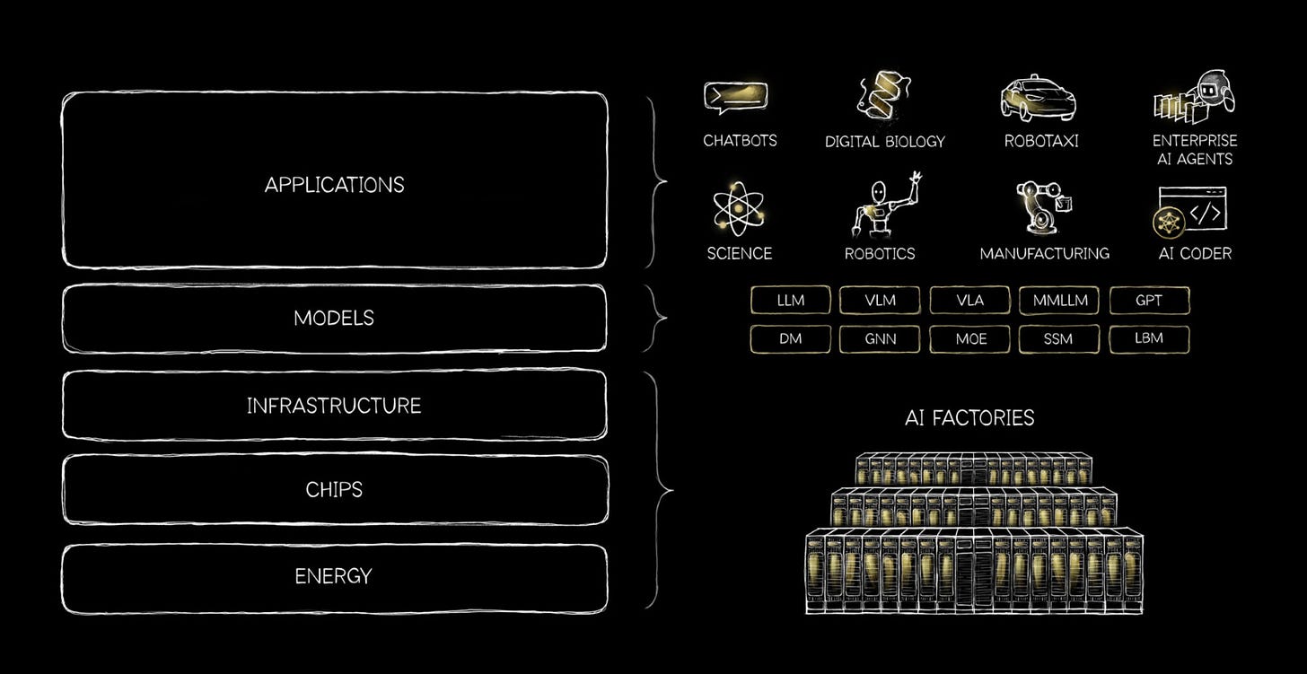 AI 구성 요소를 5계층으로 정리하면서, 거대한 인프라 투자의 당위성을 다시 한번 강조한 젠슨 황.